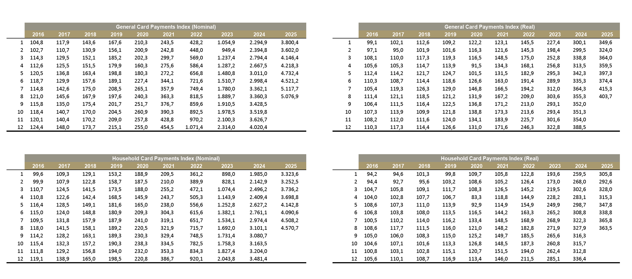 Moreover, the indices are categorized into two groups: “General Card Payments Indices” (nominal and real) are calculated using all payment transactions with domestic cards, whereas “Household Card Payments Indices” (nominal and real) are calculated based on only retail domestic transactions, i.e. card payment transactions with domestic cards excluding Private Pensions payments and Government/Tax payments.