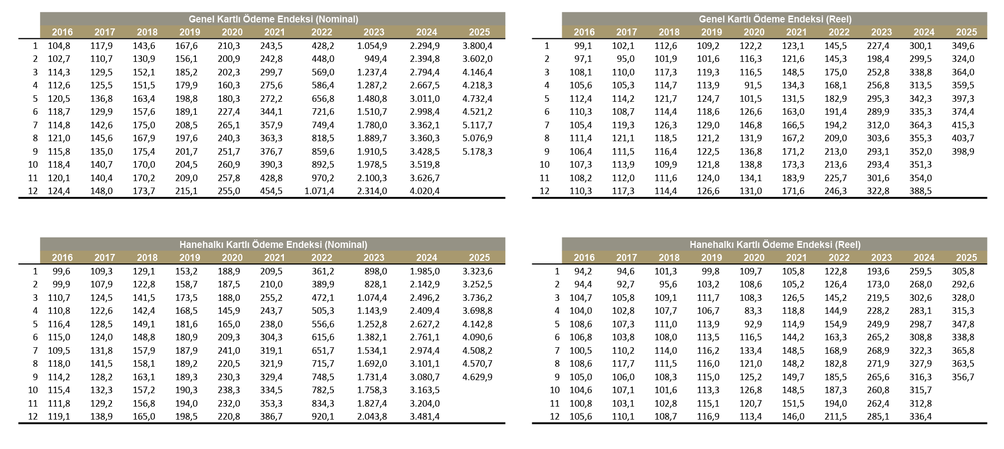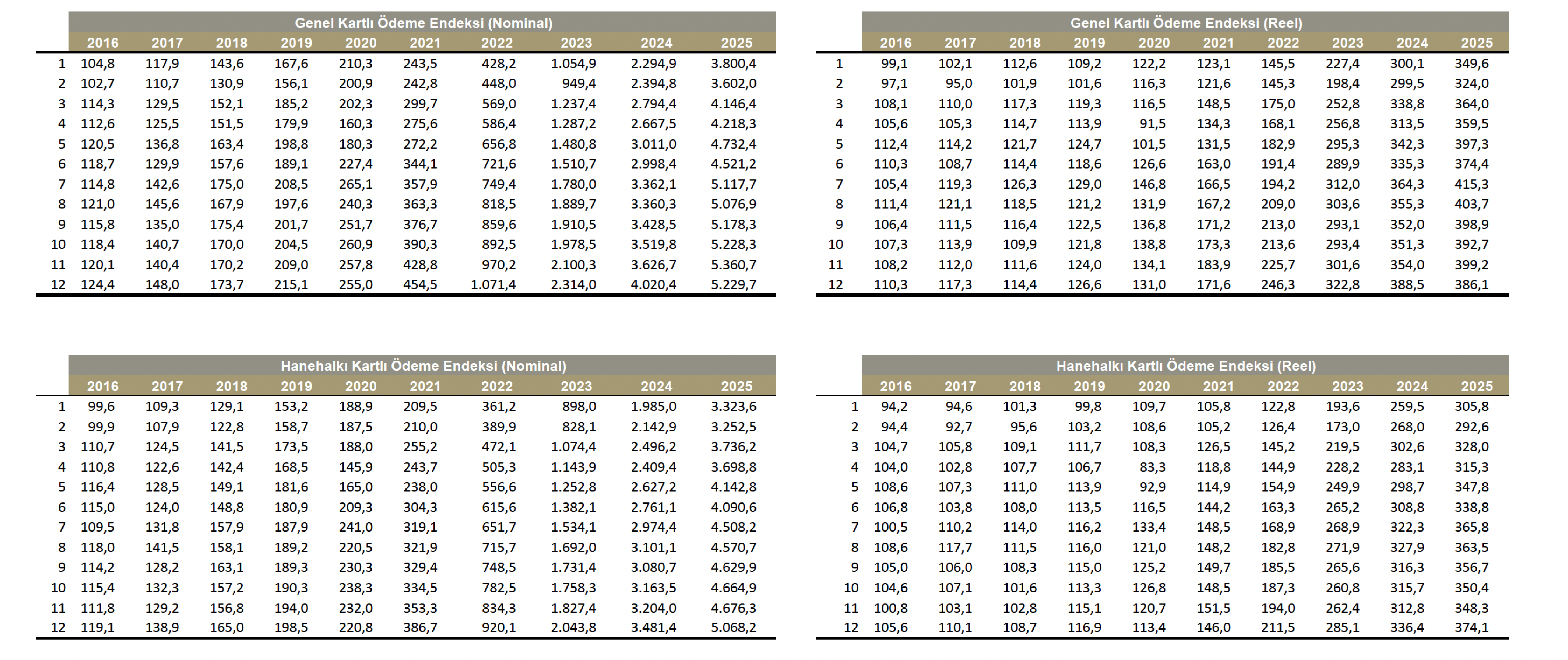 Kartlı ödemeler sektörünün ve hane halkı ödemelerinin gözlemlenebilmesi için Kartlı Ödemeler Endeksi’ni aylık olarak yayınlıyoruz. 2015 yılı Nisan ayını baz alan endekse, nominal ve enflasyondan arındırılmış (reel) olmak üzere iki farklı formatta erişebilirsiniz.